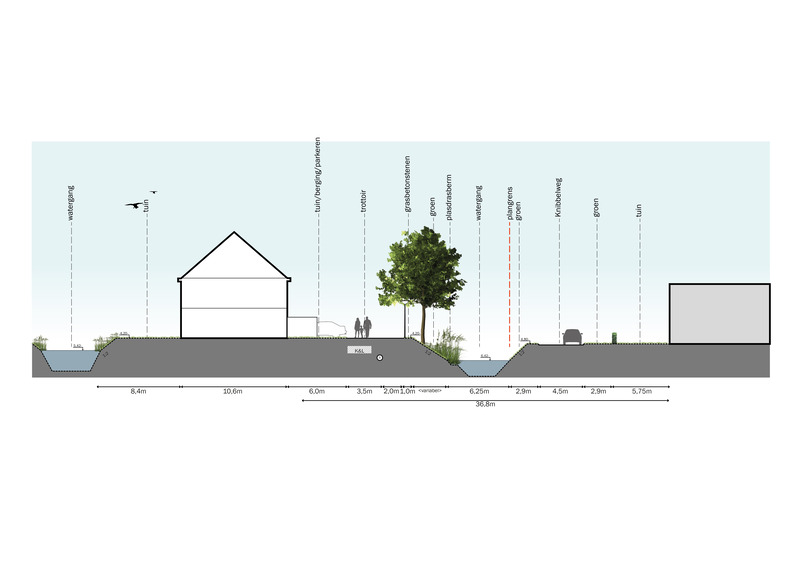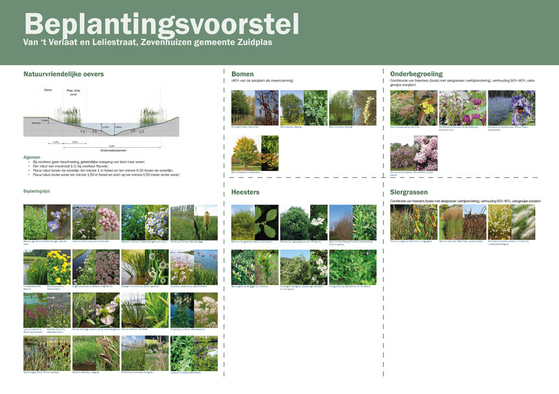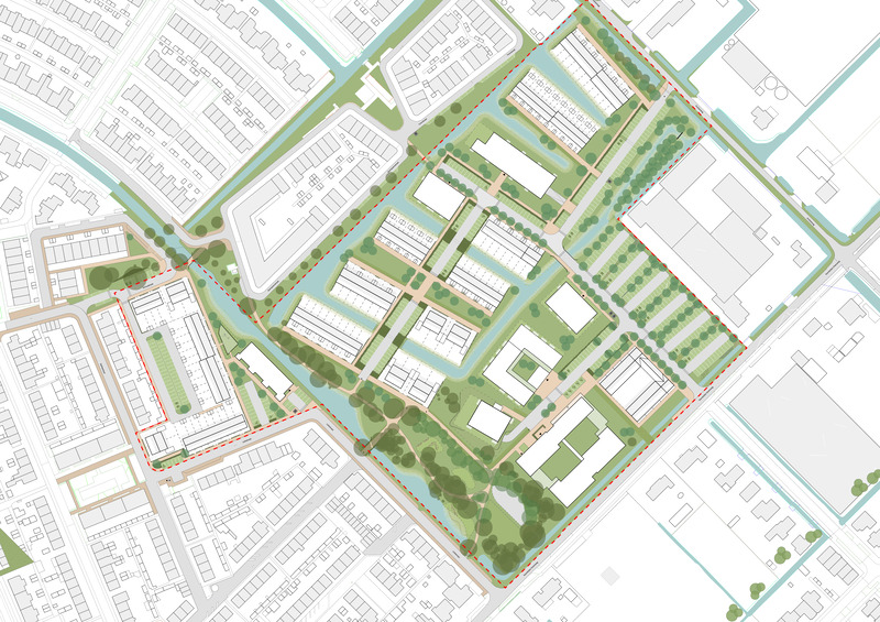 Uit meerdere ruimtelijke scenario’s is gezamenlijk gekozen voor een scenario dat uitgaat van een duurzame, waterrijke en parkachtige nieuwe woonomgeving. Het plan is dan ook opgebouwd uit waaiervormige stroken met bebouwing in het park en aan het water. De groenblauwe waaiers krijgen en natuurlijke inrichting, bestaande bomen blijven behouden en het plan voorziet in een ruime groenzone als buffer naar de aangrenzende woonwijk. Onderdeel is ook de inpassing van een woonzorginstelling die samen met andere appartementen in zuidoosthoek in het groen is gesitueerd. In het inrichtingsplan en het beeldkwaliteitsplan is er veel aandacht voor water, duurzaamheid en biodiversiteit. We zijn trots op het resultaat; een duurzame groene omgeving voor een diversiteit aan toekomstige bewoners en gebruikers!